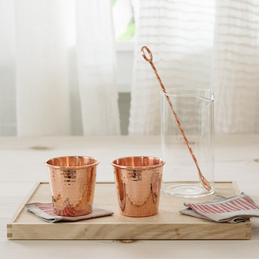 In Aruyvedic tradition, drinking "Apa" or water in copper promotes healing and longevity. Handcrafted in Mexico with 100% recycled copper, these hammered cups will keep your drinks nicely cooled and your home bar cooler–an artisan cocktail-maker's dream. Cups hold 12 ounces.