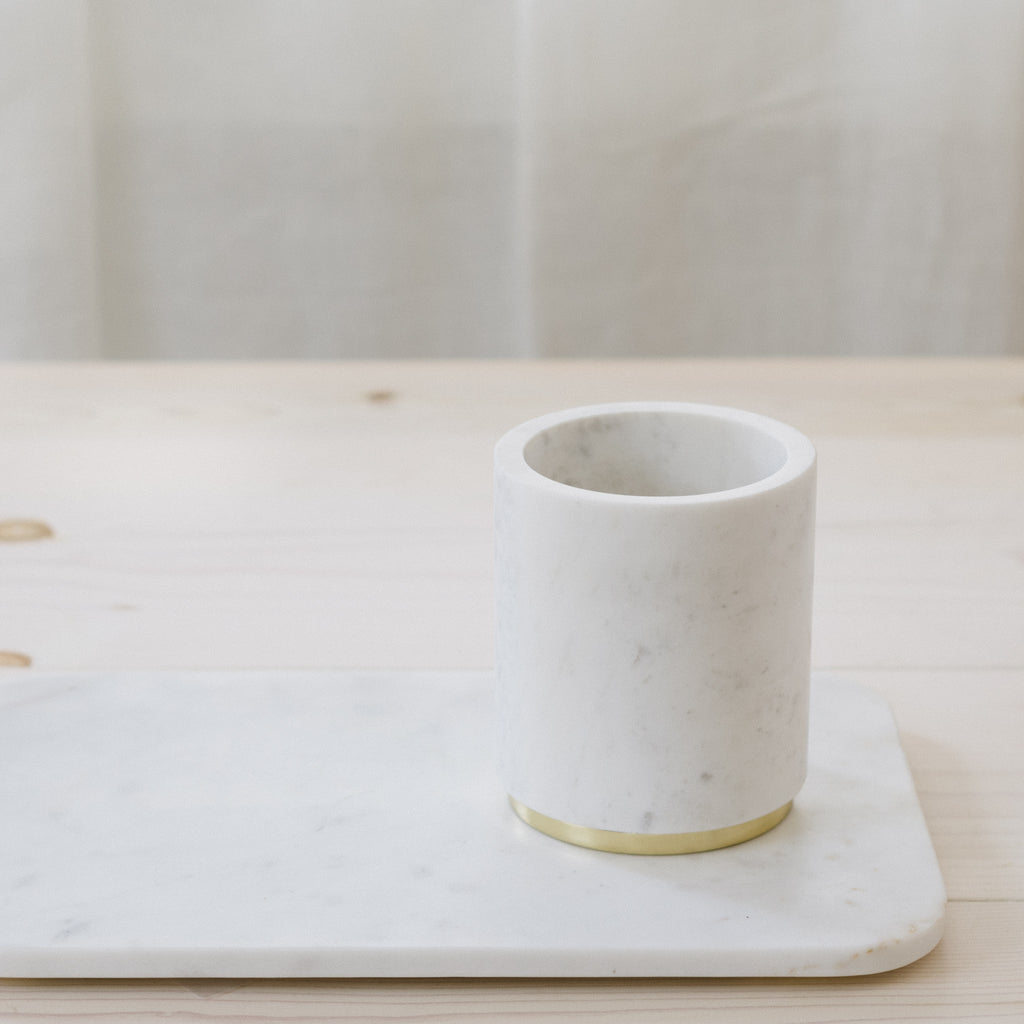 Constructed of a hollowed white marble block + finished with brass details, the Mara Utility Canister makes an ideal utensil holder or a beautiful refrigerated wine chiller.