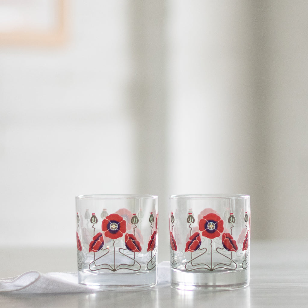 Perfectly suited for a patio vodka tonic, these 11-ounce retro glasses add Mad Men nostalgia to any cool refresher. Featuring Art Nouveau-inspired red or golden poppies, this chip-resistant modern barware is an hommage to the playful spirit of the Amerian cocktail tradition.