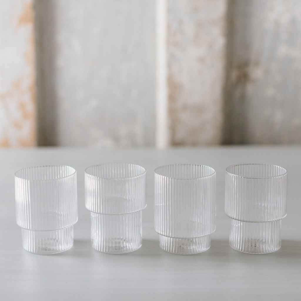 Crafted for everyday sophistication, this artisan glassware is mouth-blown with geometric forms and a delicate rippled texture. A masterful mingling of design and function, glasses feature a narrow base for stacking and easy handling. Glasses are sold in sets of four.