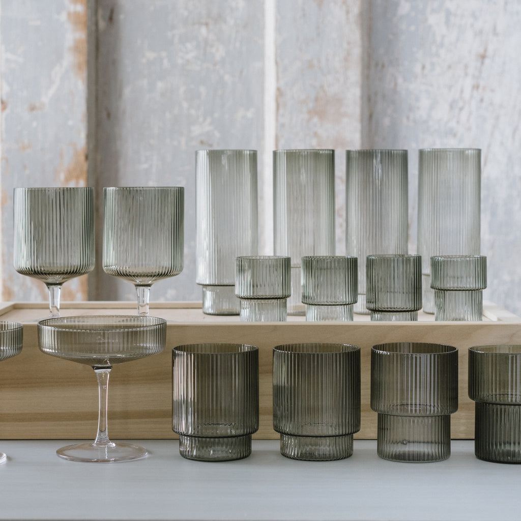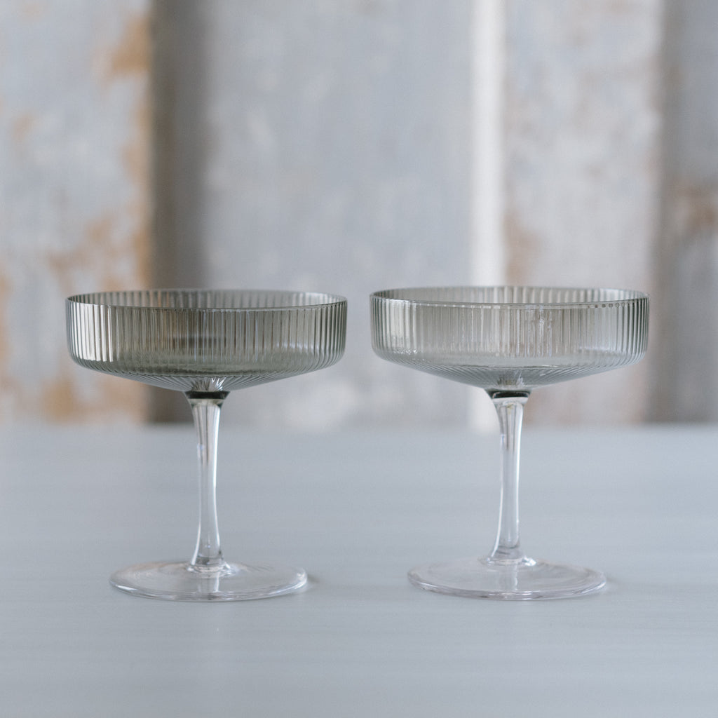 A blend of Scandinavian design and mid-century charm, these stylish saucers will level up any sparkling wine or craft cocktail occasion. Truly one-of-a-kind, each coupe glass is individualy mouth-blown and features a delicate rippled surface and short, slender stem. Glasses are sold in sets of two.