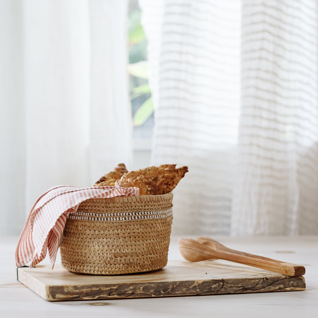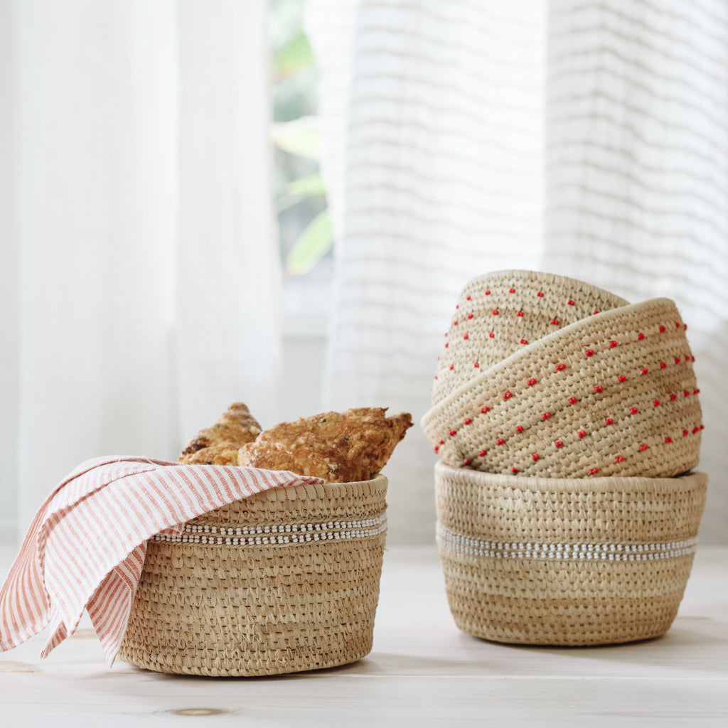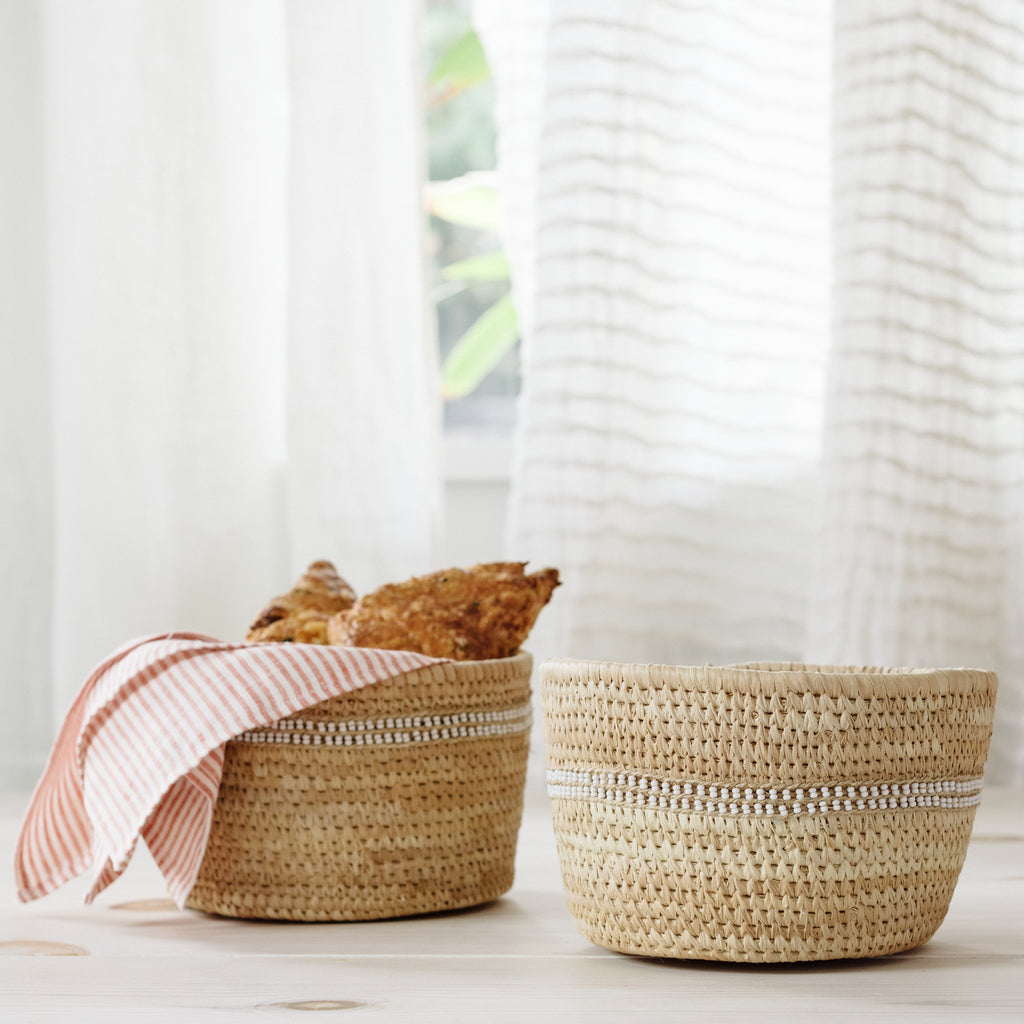 Nomadic baskets are sold in two useful nesting sizes and are dotted with white beads. Because these baskets are handcrafted, each will vary slightly.