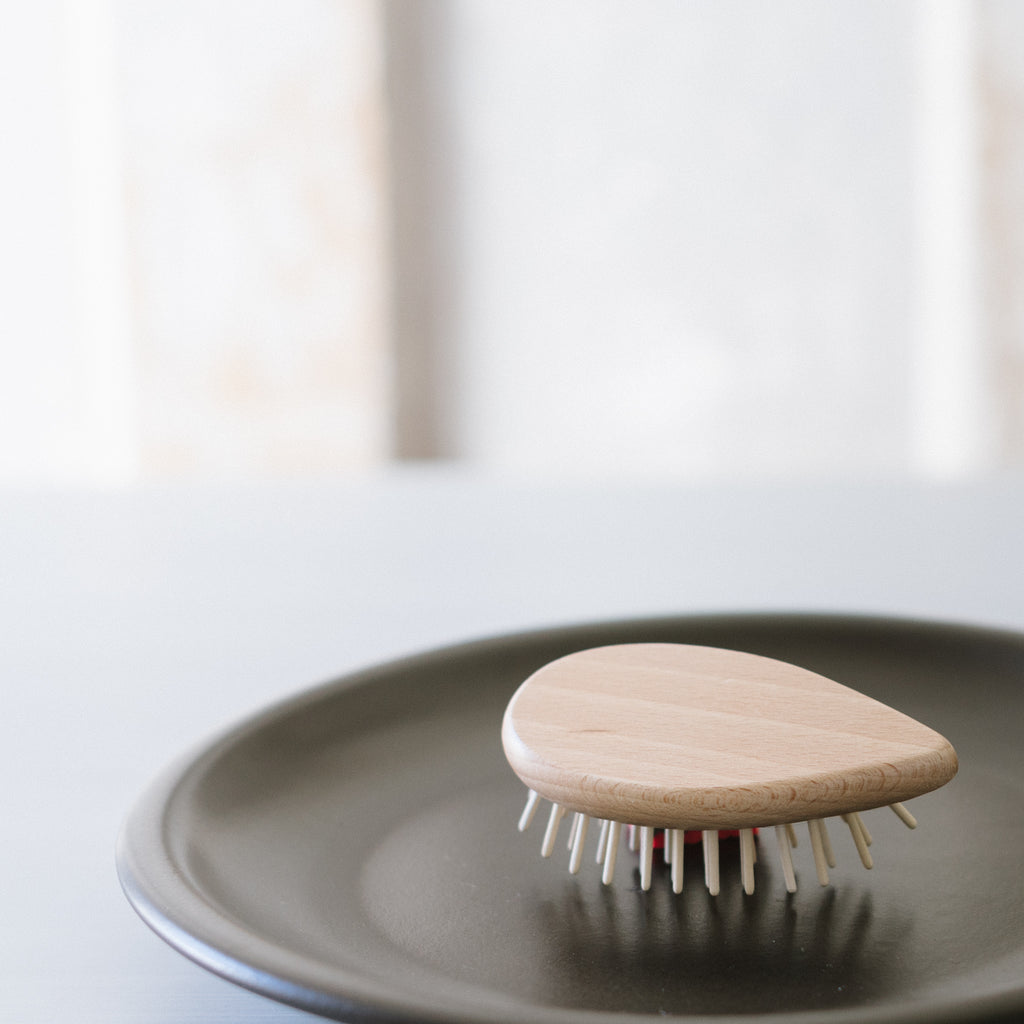 Cute, curved, hedgehod-shaped handle comfortably contours the palm. Each maplewood pin is enrobed a waxy, environmentally-friendly coating that glides through knots and tangles. Narrow pins provide pleasant scalp care, pampering coarse, fine, or brittle hair; unlike metal or plastic, Redecker's wooden pins are anti-static and non-conductive.
