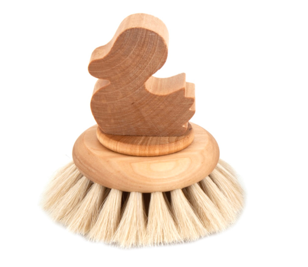 A hand made duck bath brush in oiled maple and horse hair. Horse hair is an excellent material in bathing brushes because it is soft and pliable while i is sturdy and durable and has a certain elasticity. Along with a good soap it gives a soft and comfortable lather for perfect cleaning.  Allow the brush to dry standing on the horsehair so that the water is transported away from the wood that is more sensitive to moisture.