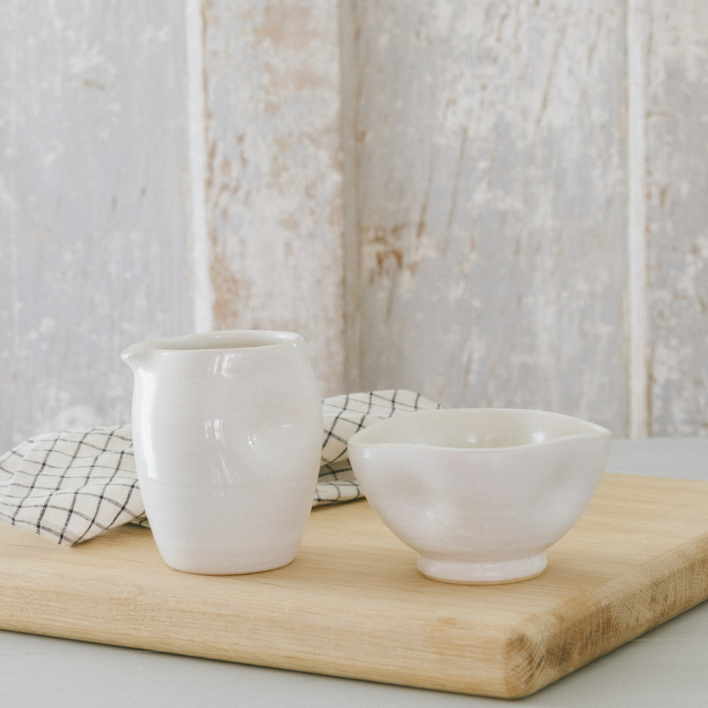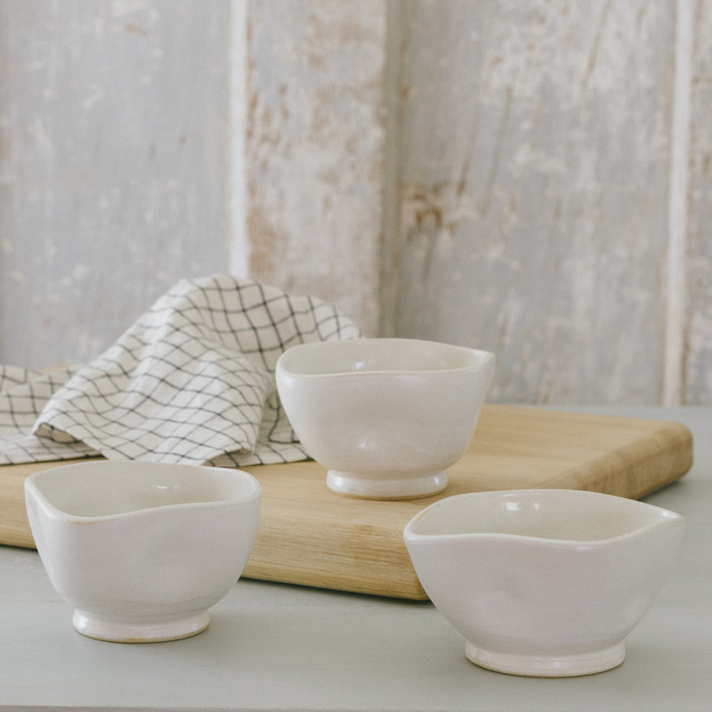 Each of these bowls begin life as a classic wheel thrown bowl with a trimmed foot. Before the clay dies, the belly is hand altered with the addition of four deep indentations and the rim is reshaped with a wood paddle. The stoneware bowl is then finished with white, lead-free glaze.