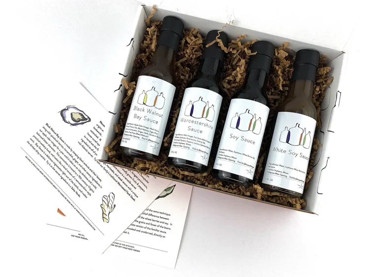 What makes Keepwell Vinegar, Keepwell Vinegar. These sauces are combinations of soy sauce and vinegar techniques, great farming of staples like soybeans and rare treasures like local greenhouse citrus, full of foraged ingredients, all bearing the weight of years of fermentation and aging. These sauces can all be used in recipes or on their own as finishing moves. Each box comes complete with an introduction to each sauce and suggested uses and recipes.