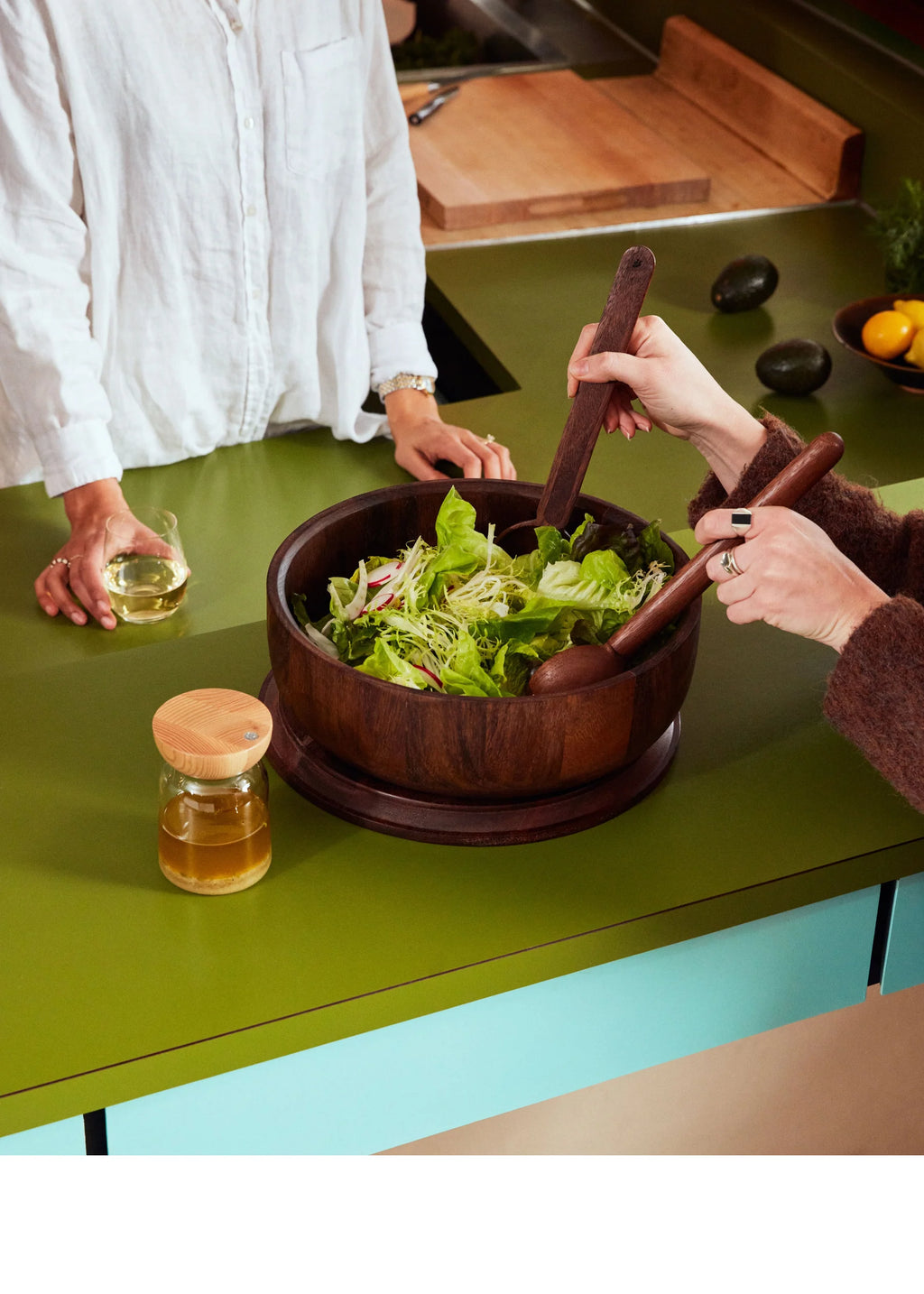 Our Totter Salad Dressing Shaker has an elevated design that can be used both in the kitchen and on the tabletop. The handblown glass vessel is perfect for mixing your favorite dressing. Simply add the ingredients to the vessel, secure the ash wood lid, and shake it well to emulsify. The hidden silicone gasket ensures no leaks and can be easily cleaned by untwisting and placing in the dishwasher.