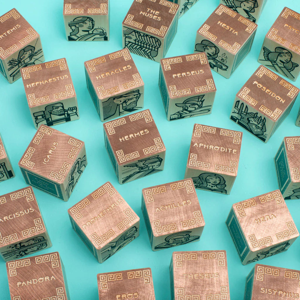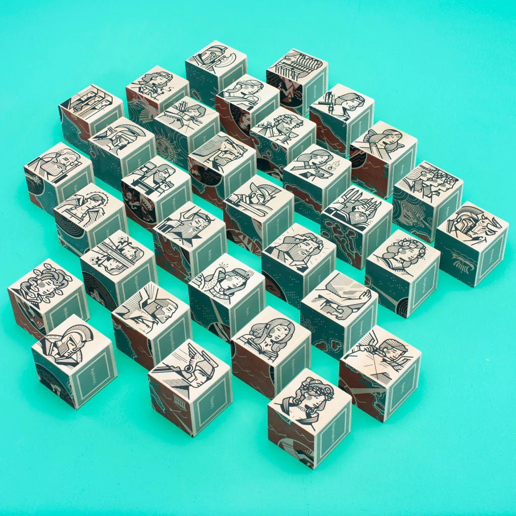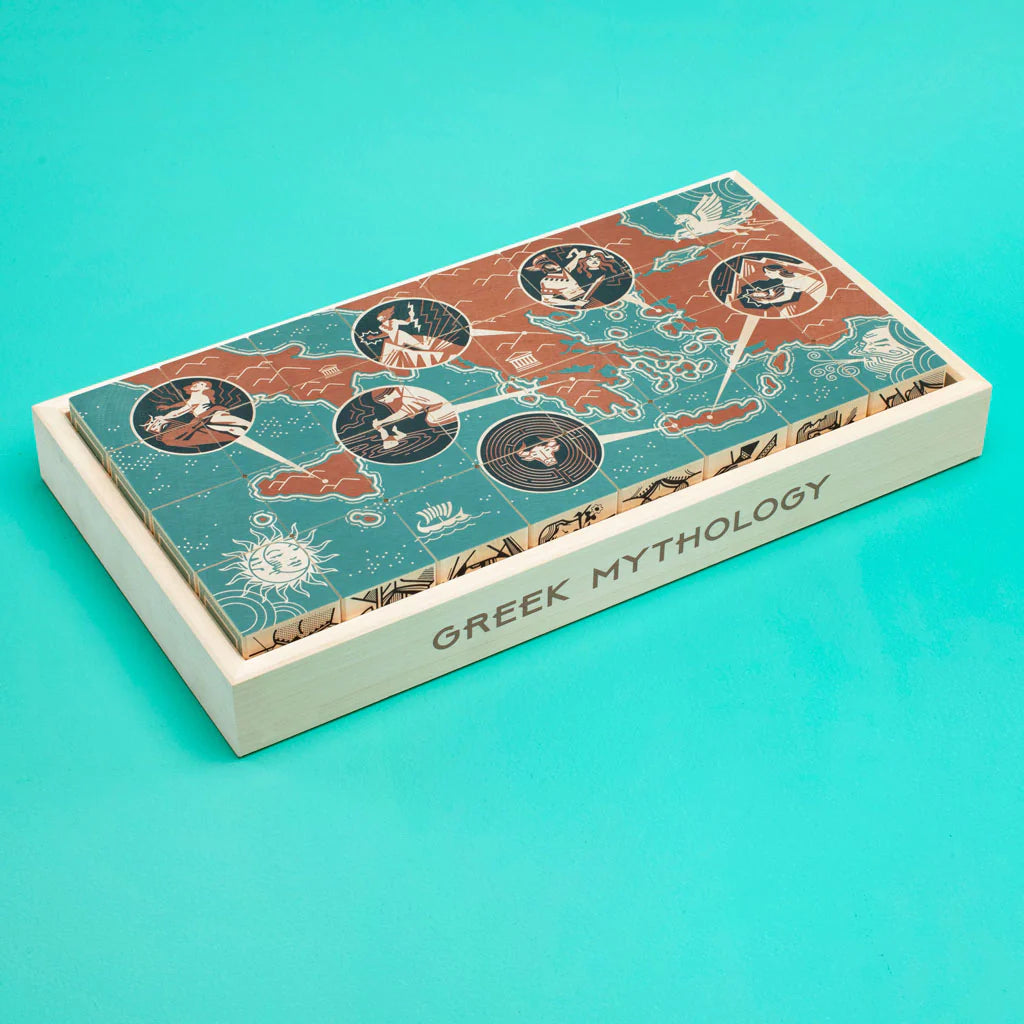Gods, goddesses, monsters, and more! Explore 32 classic characters from Greek Mythology. Each colorful block features a hand drawn character. Discover their mythic roles on one side. Find English, Greek, Roman names on three sides. Enjoy the Greek mythology adventure puzzle. Showcase these handsome blocks and puzzle in a wood tray.