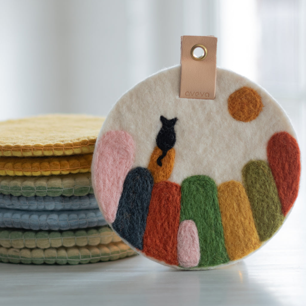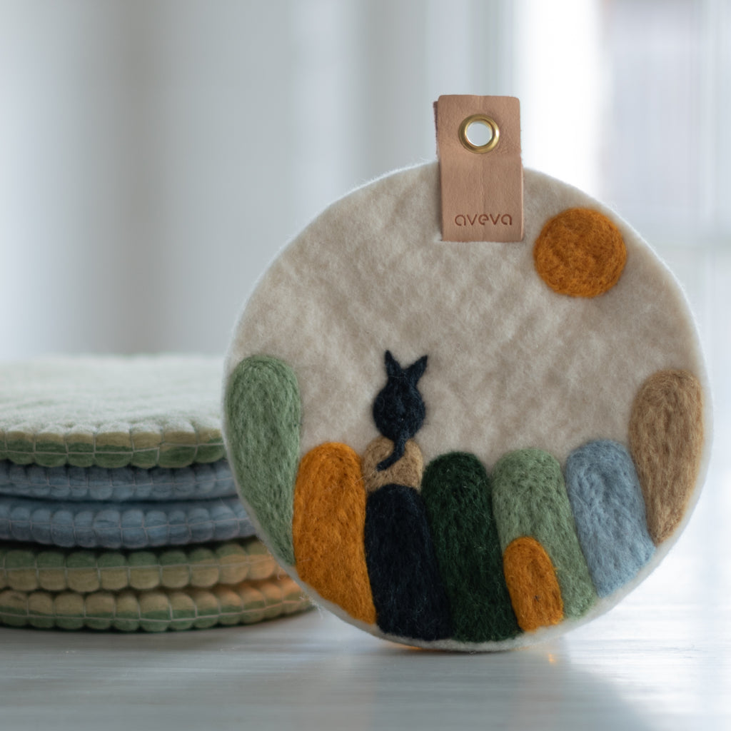 Locally inspired art for your table setting, and a piece of art on a hook when not in use. Perfect to place the pots on because wool as material is both dirt and heat-repellent. Our handmade trivets both protect, decorate and color the table. As for all of our wool products, this trivet is made of high-quality wool, AZO-free colors, and is naturally heat and stain-resistant. All our trivets have a loop for suspension so they can both decorate the wall as well as the table.
