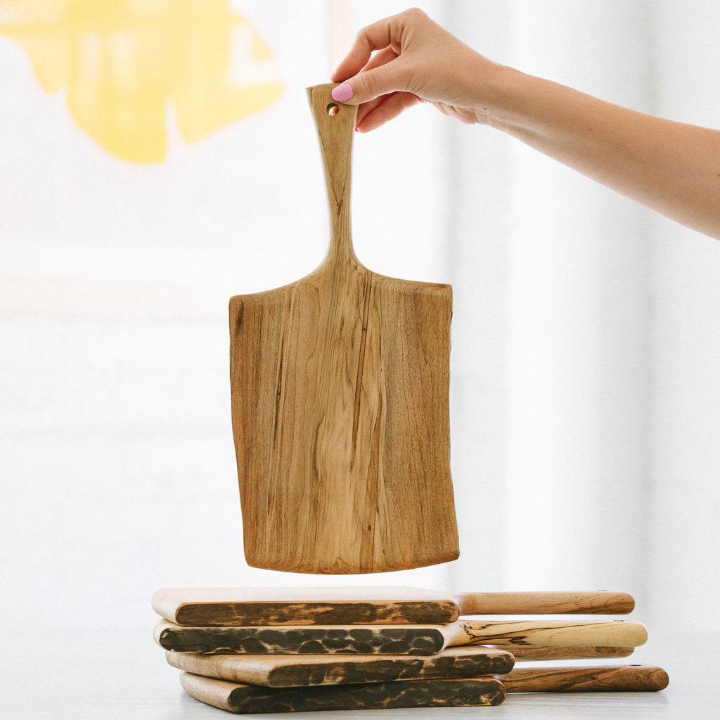 Our handled serving boards are functional for cutting but beautiful enough to hang on your wall when not in use.  We suggest cutting on one size and serving on the other.  These cutting boards make a beautiful platter for charcuterie, cheese and appetizers.