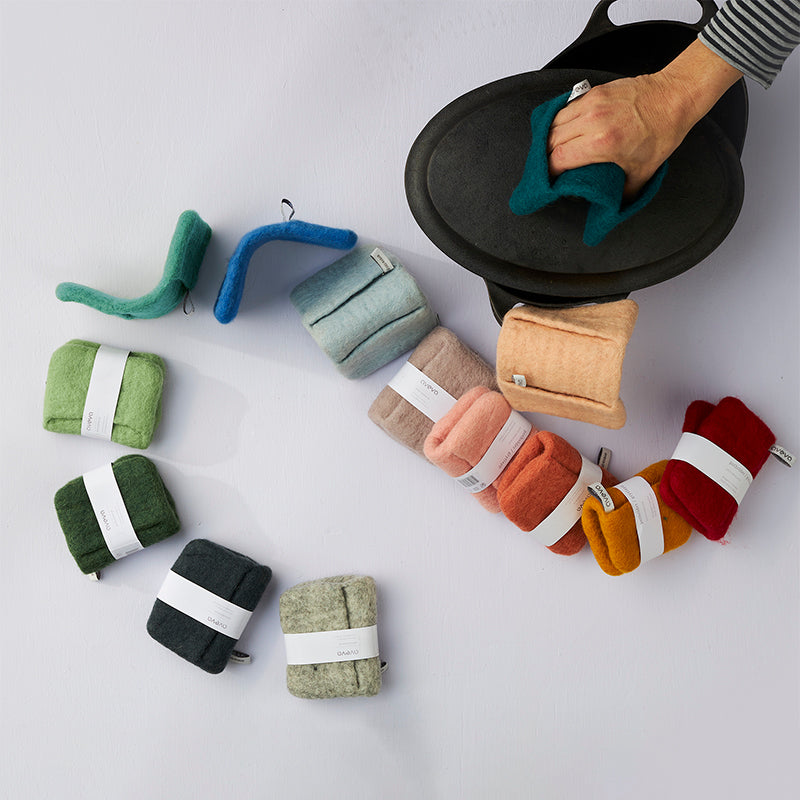 Colorful handmade potholders in 100% wool for all hot things. The wool has many good qualities and is optimal for use in the kitchen. The potholders are dirt-repellent, durable, and insulating to name a few good qualities. Here we have created a simple grip form for the potholder, which you easily grab with one hand. The potholder also has a loop so you can hang it up when you do not use the potholder. Made with AZO-free colors.