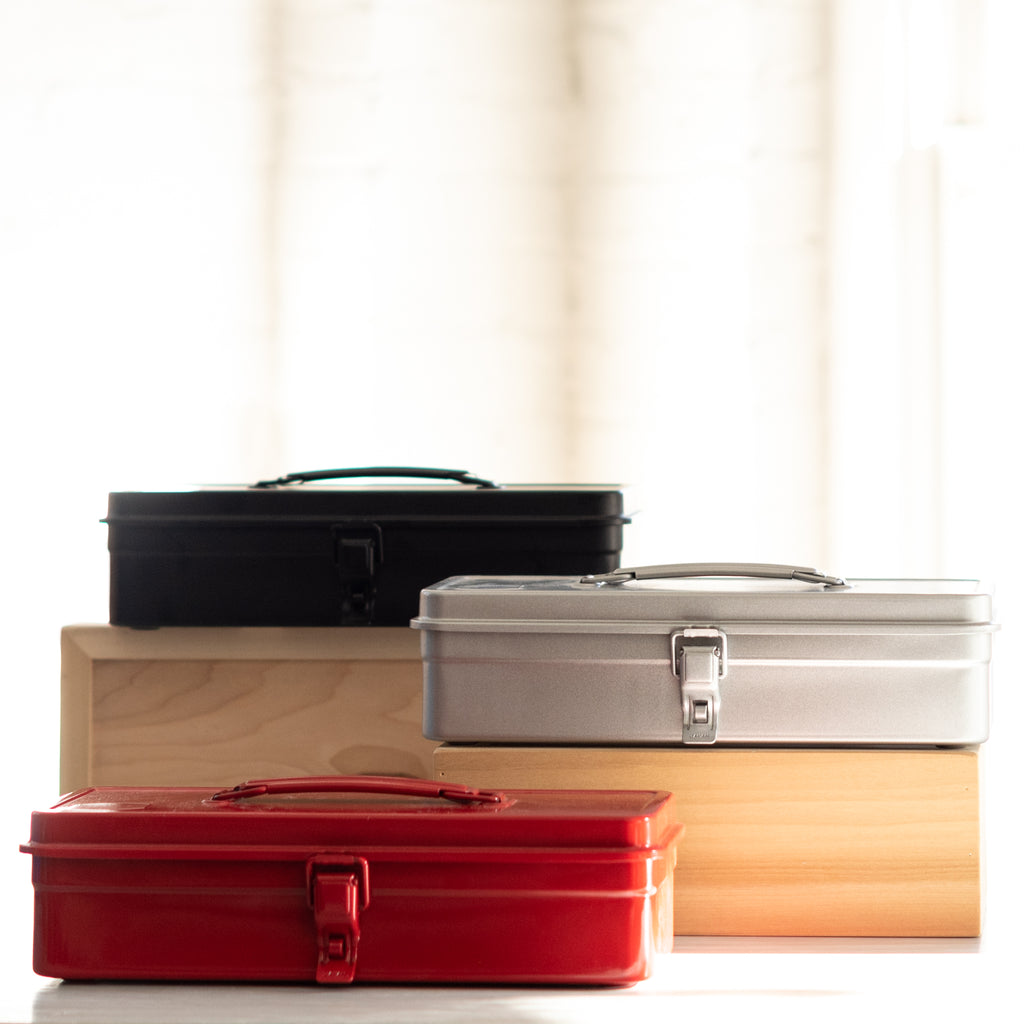 Flat:Steel toolbox with flat lid and top extendable handle. Produced from one piece of steel, resulting in water-tightness, no sharp edges and unmatched strength. Use for tools, art supplies, make-up - the possibilities are endless!