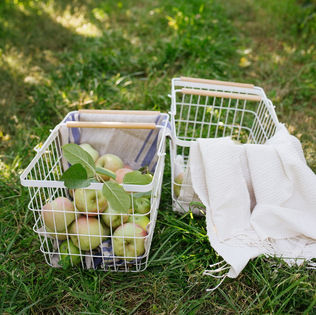 An elevated essential. Never before has laundry looked so clean! Skip the plastic and embrace the white steel and thin wire design of our Tosca Series metal baskets. Available in two sizes, small and large. The hamper's airy frame helps keep your clothing fresh and has a place in any style home. The warm wooden handles collapse, allowing you to tote your laundry from room to room with just one hand. May even make washing, drying, and folding day just a little bit brighter.