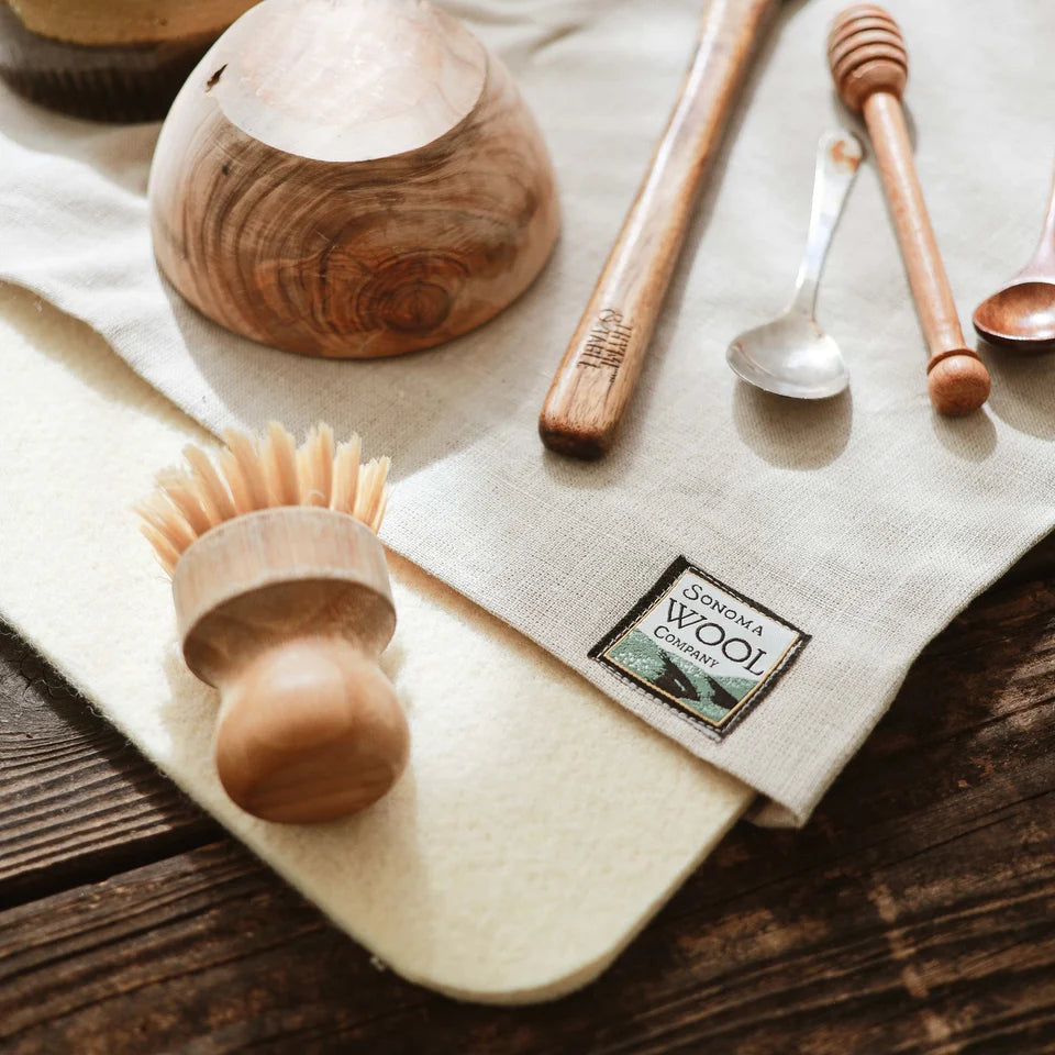 Care: The Dish Drying Mat needs to fully dry between uses, which will naturally occur when kept on counter. If your wool dish drying mat is heavily used to the point of saturation, hang the mat between uses to increase air flow. If needed, your mat may be spot cleaned with a mild soap in tepid water. Dry flat. Do not machine wash. Linen sleeve may be machine washed and we recommend air-drying to maximize it's lifetime.