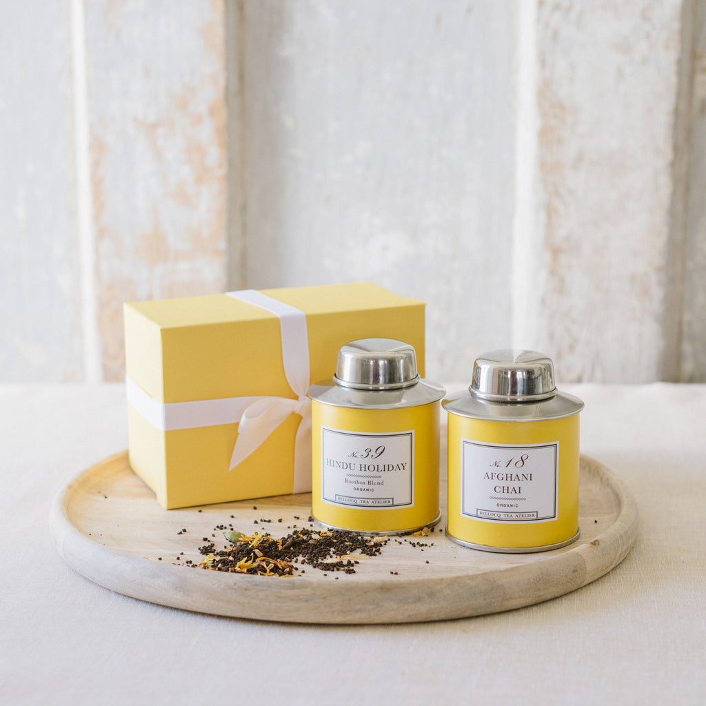 A selection of Bellocq's finest chai blends to please all your guests, this delightful set includes both a black tea blend and a caffeine-free rooibos blend. Each chai comes heartily spiced and lovingly presented in two traveler caddies. We're anticipating that you'll enjoy these blends as much as we do!