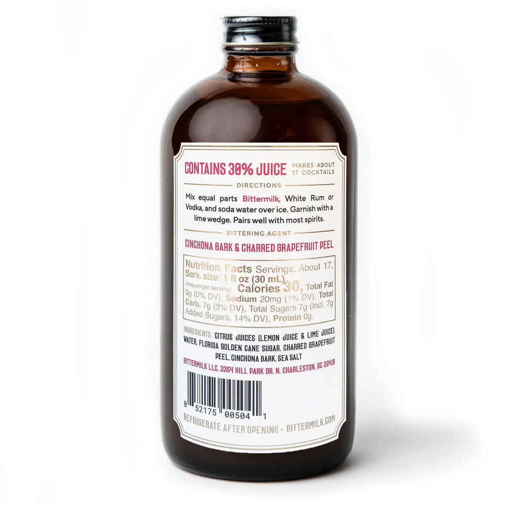 • Ingredients: Lime Juice, Water, Florida Golden Cane Sugar, Charred Grapefruit Peel, Cinchona Bark, Sea Salt