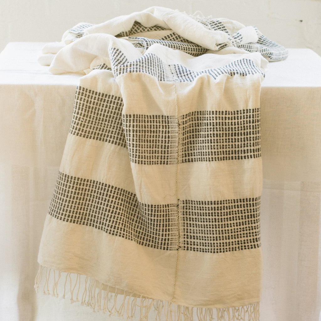 This versatile, lightweight queen blanket showcases the best in luxury bedding. Each piece is meticulously hand-woven in Ethiopia and features a bold color-blocked dotted pattern. Three separate panels are then bound together using traditional stitching techniques. Hand-spun Ethiopian cotton offers a uniquely rich texture that will continue to soften with each wash and dry.
