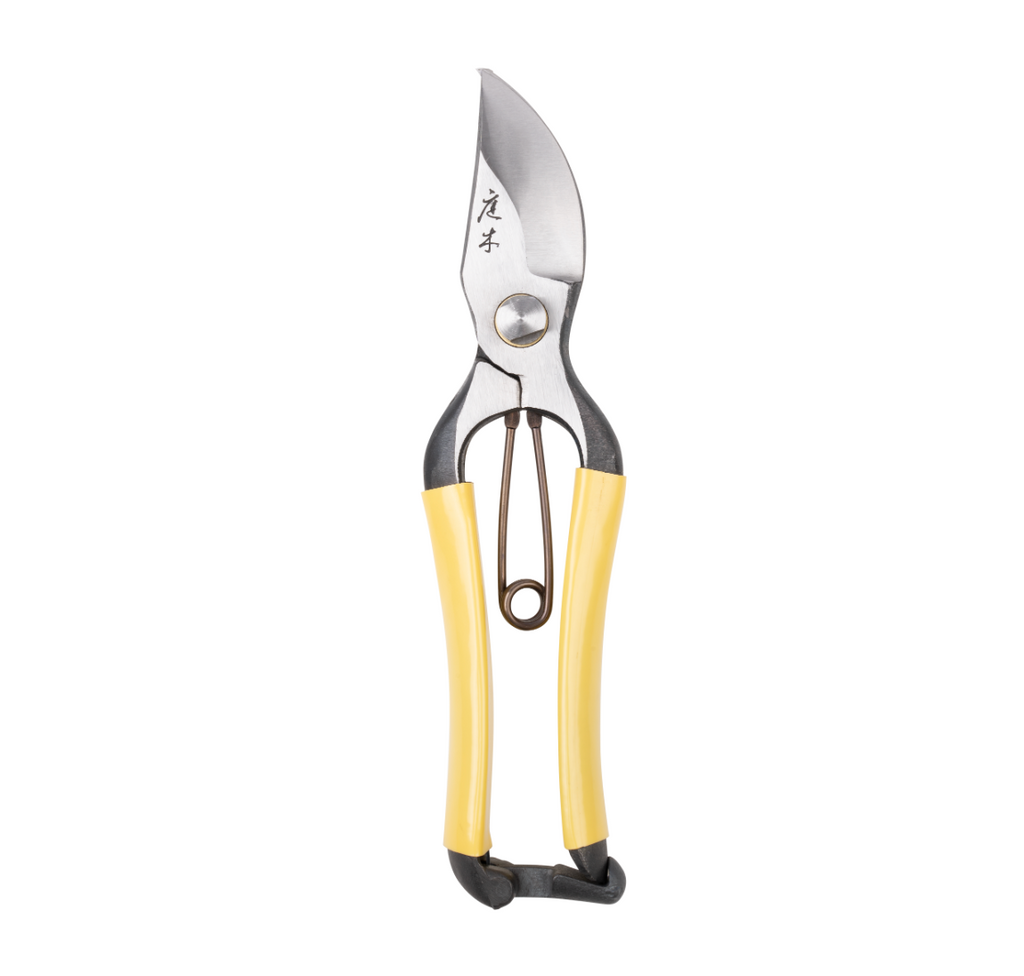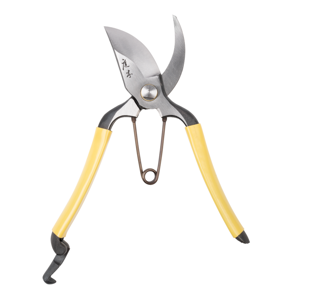 Drop forged and hand finished in Yamagata, deep in the mountains of North Japan, our ‘double yellows’ are the perfect combination of refined craftsmanship and every day usability. Tough carbon steel holds a mean edge, the chunky catch at the bottom and the strong spring gives a reassuringly simple functional feel, and the yellow grips show up when you’ve left them somewhere in the garden (or you can remove them for a more traditional look.)