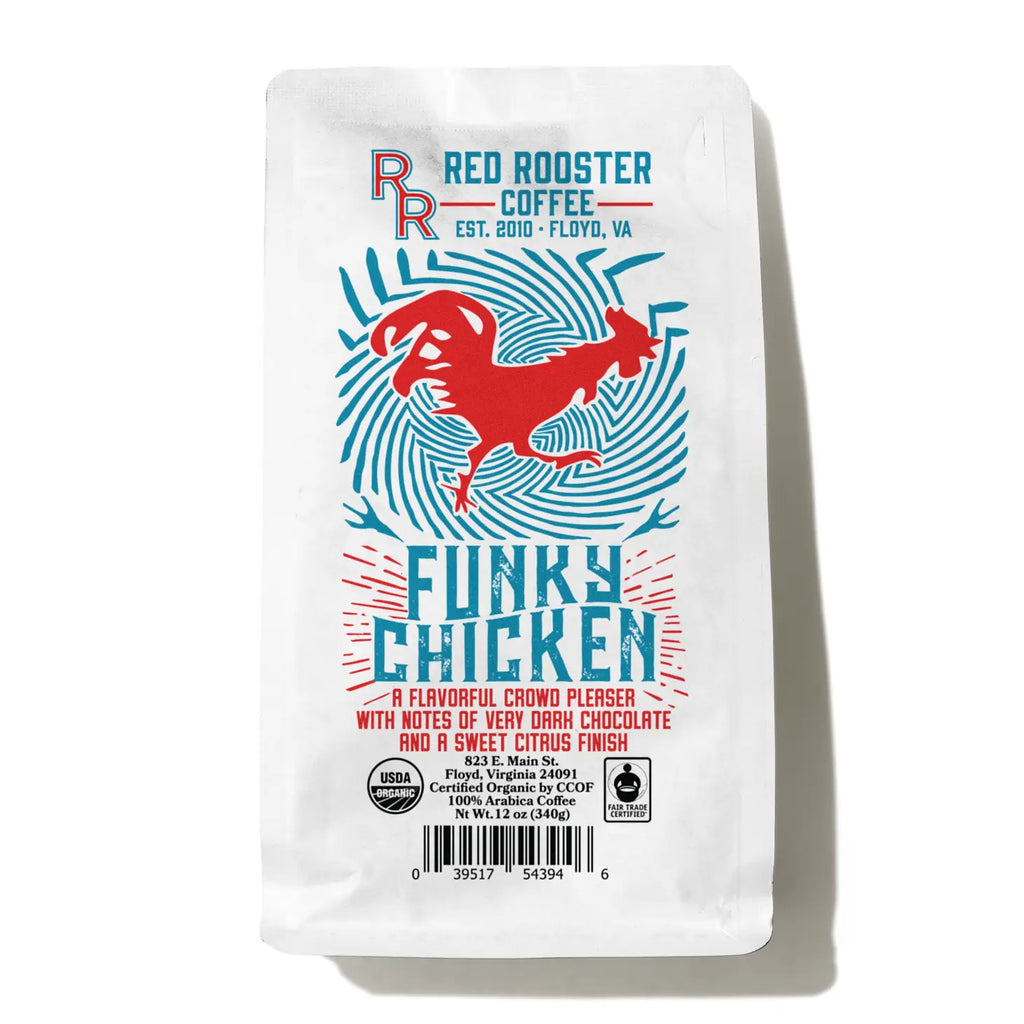 One of our most popular blends is also in DECAF! With likeness of the Funky Chicken, its combination of a Central American and Indonesian coffee produces a bright acidity and caramel sweetness.