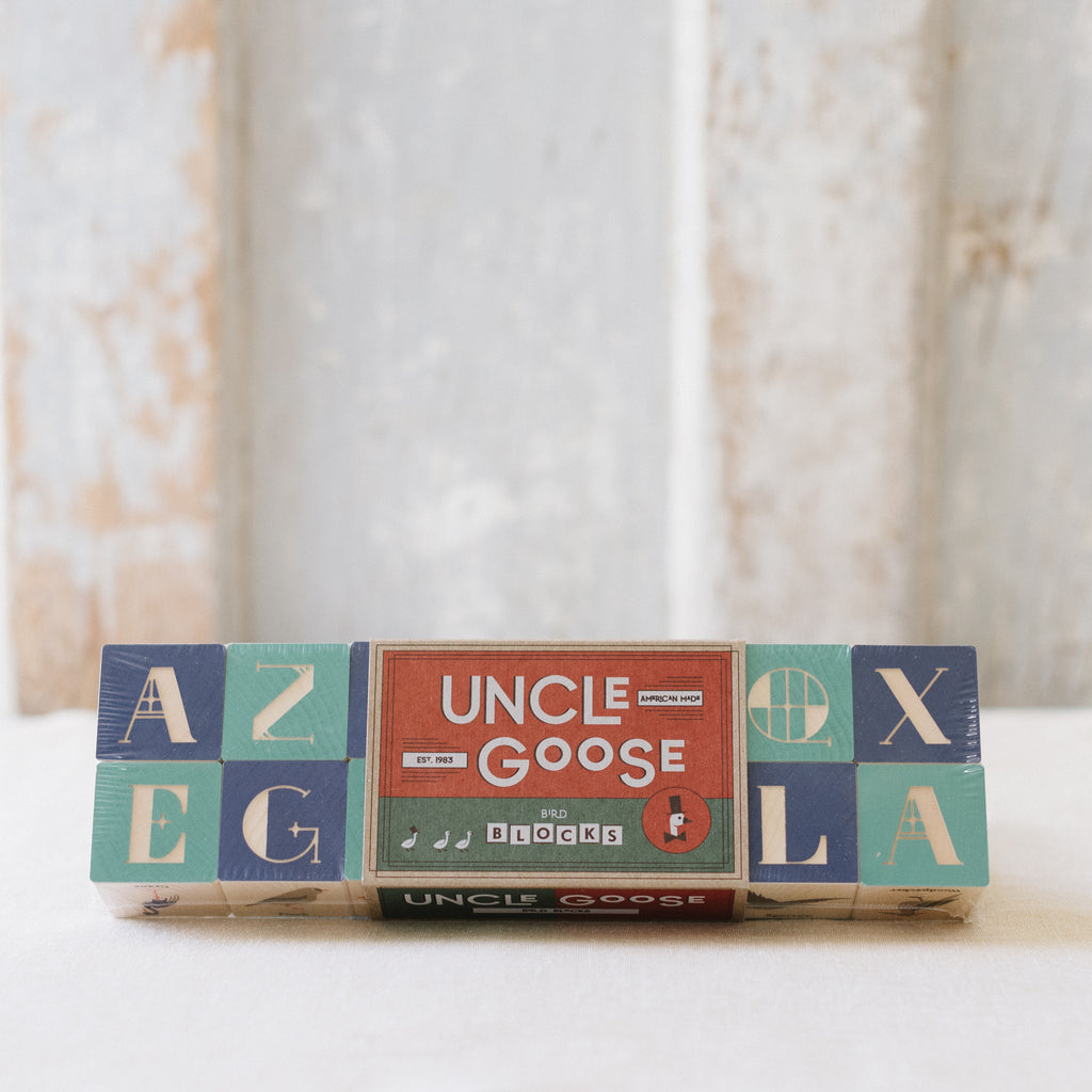 One side of each block reveals a close up of the bird featured on its opposite. Colorful Art Nouveau letters grace the remaining sides. Two debossed letters on each block.