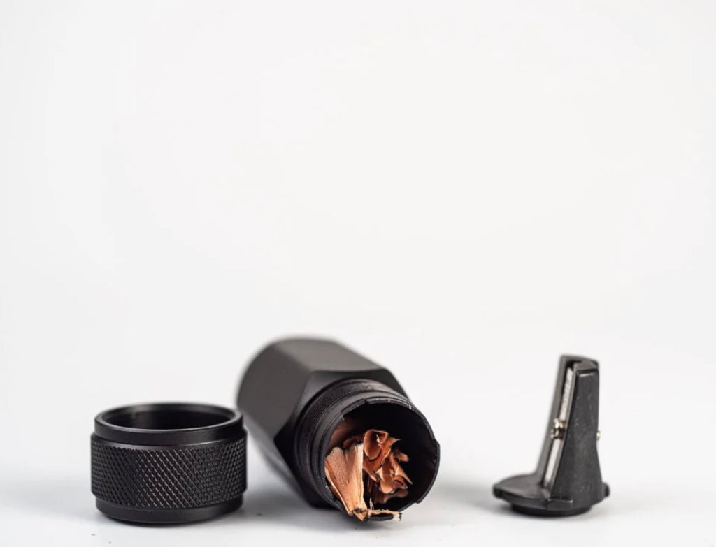 The body is made of durable machined aluminum and the sharpening unit features a German steel blade. The canister can hold three fresh sharpens before needing to be emptied.