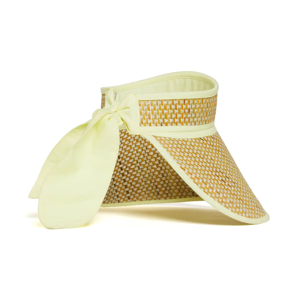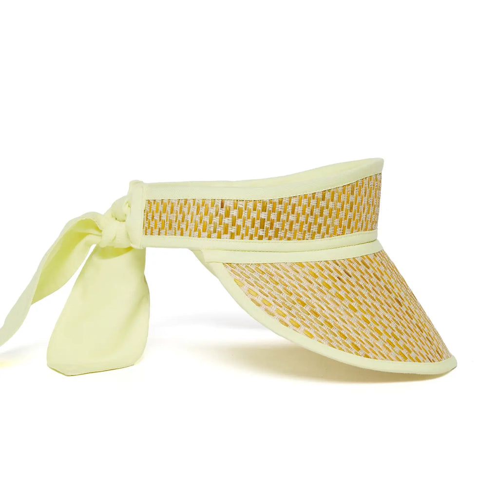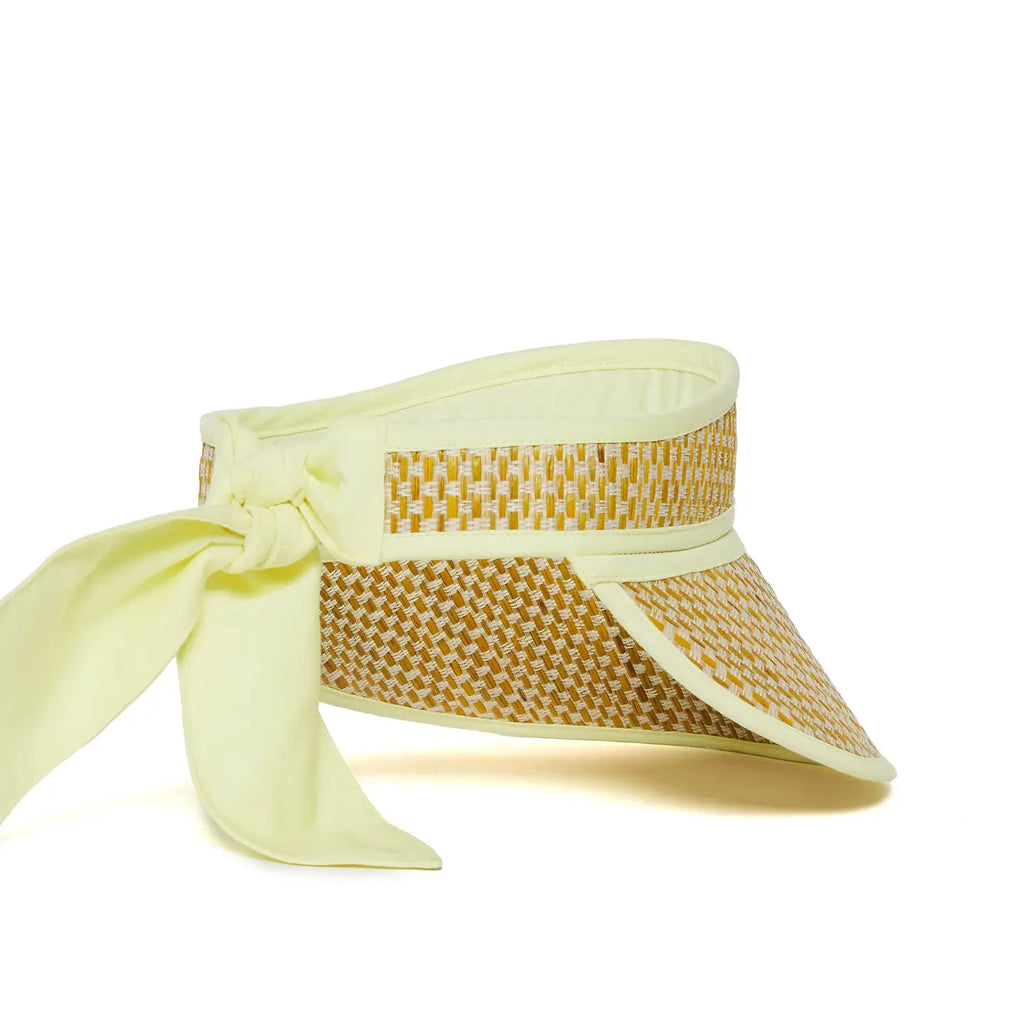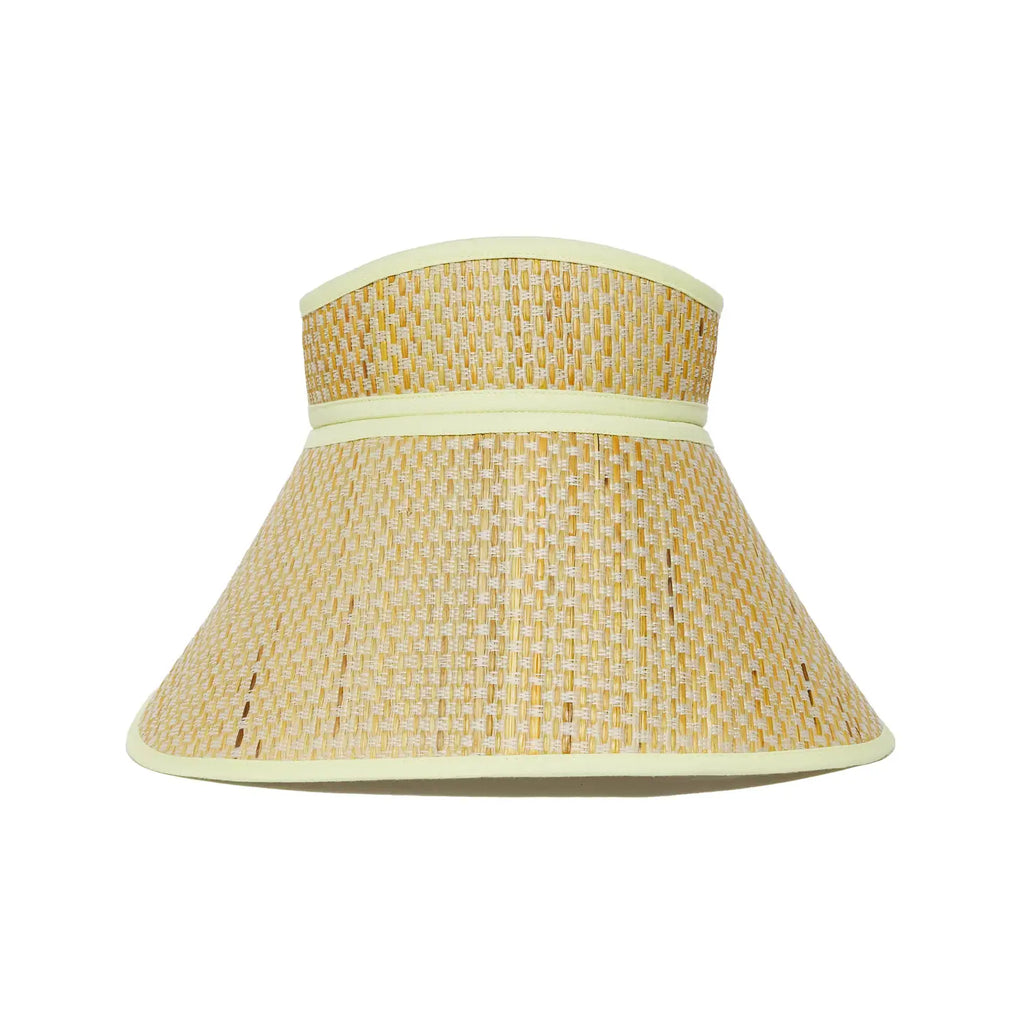Byron features white-coloured thread in a basket weave, woven through its natural grass fibre base, which has been lightly hand-dyed to create a sunny yellow base, with pastel yellow fabric trimming.