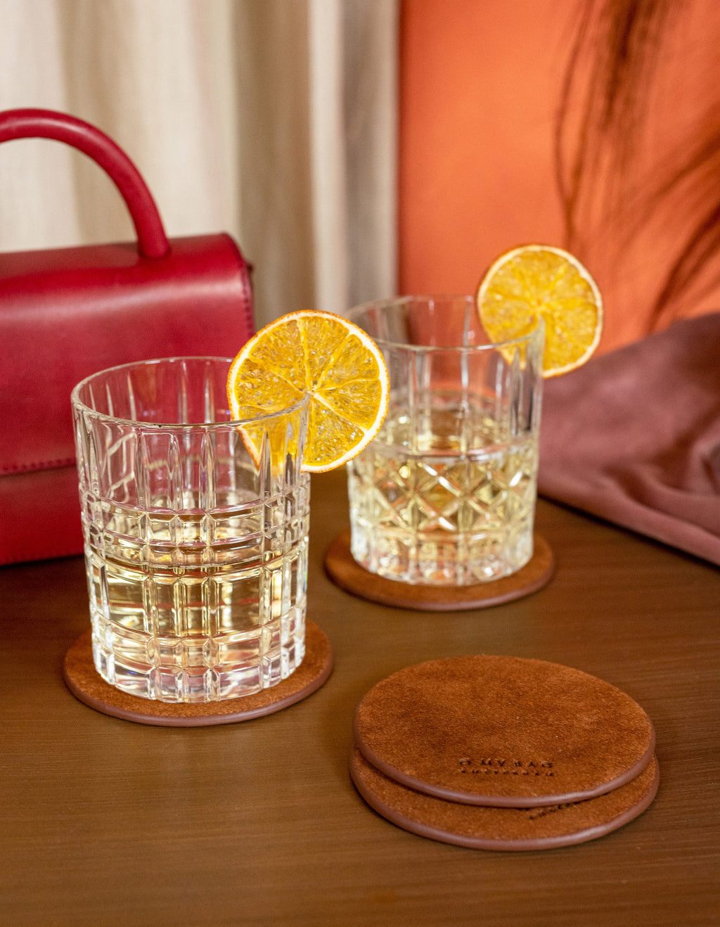 Whether you’re serving tea or hosting a luxurious cocktail party, there’s no wrong way to make use of our leather coasters. This set of 4 is double sided, featuring brown suede on one side, and our soft grain leather on the other. The double sided design will prevent scratches and slippage, while looking super chic. This set comes with our custom leather strap for easy storage.