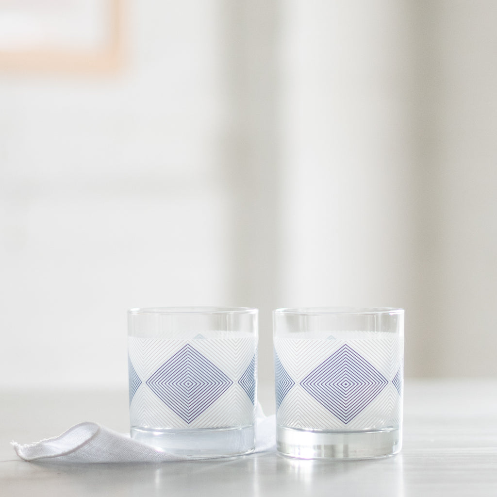 Inspired by Mid Century infinity art, our Hypnotic Blue Diamond Rocks glasses feature a band of blue nested square diamond lines offset by white inverted and nested half square diamond lines. Because of the fine geometric line design, these mod glasses feel great in the hand.