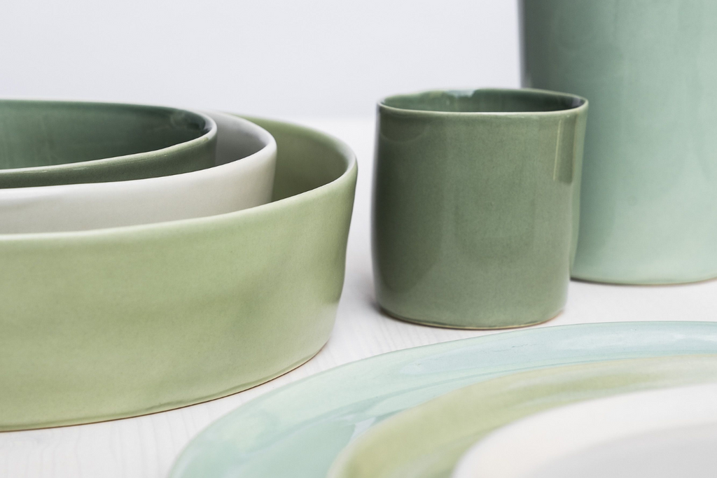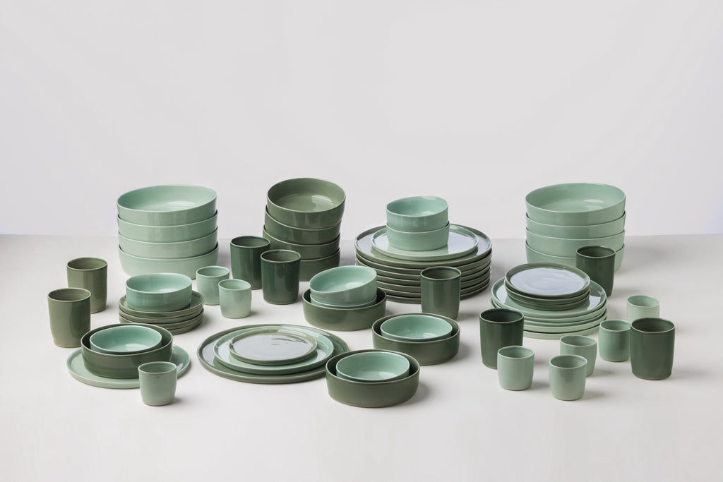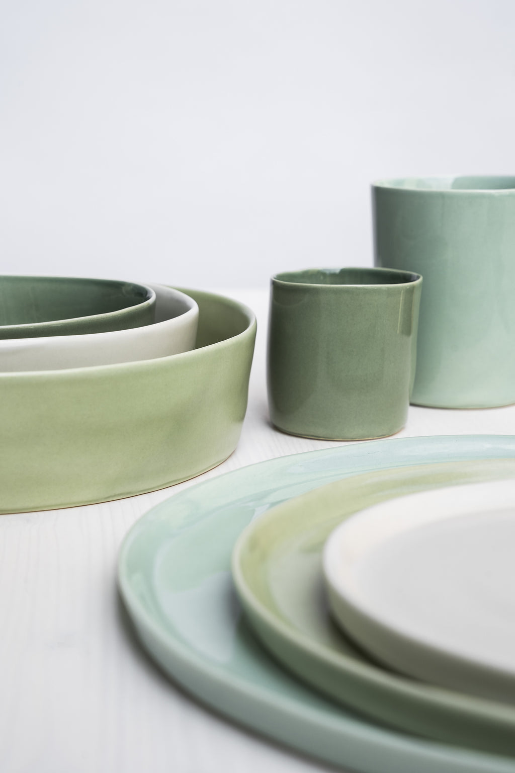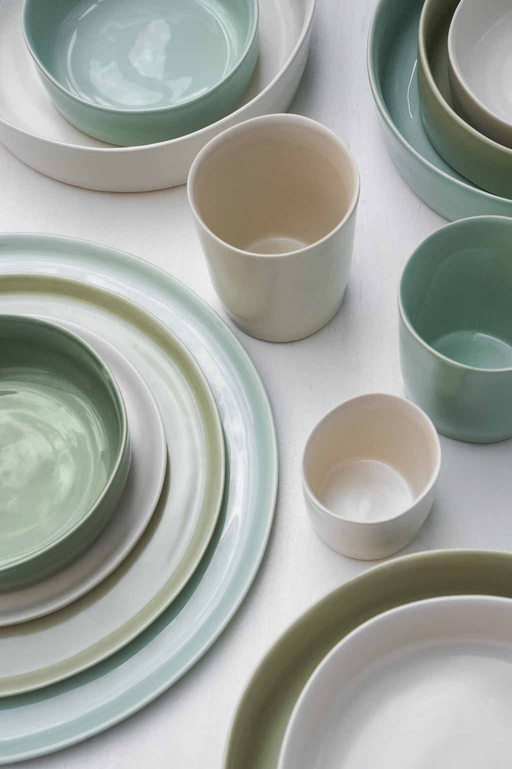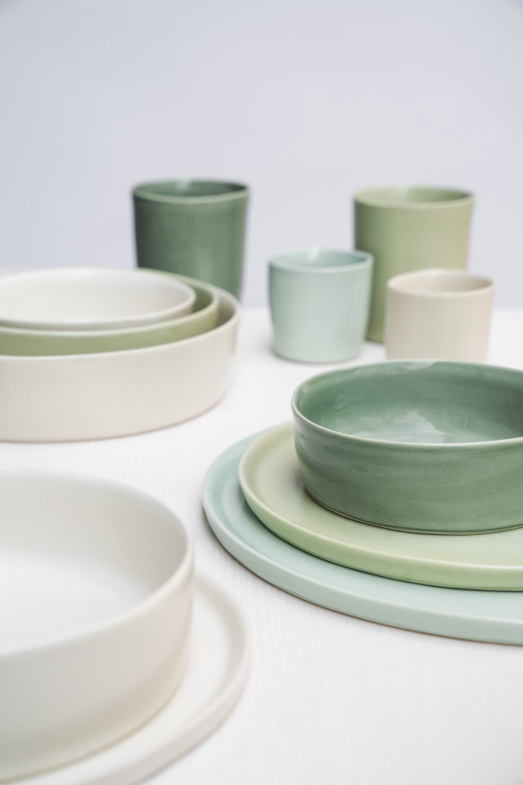 The ELEPHANT FEET earthenware is based on the work of the artist with whom we work. He has been working with celadone paints for over 20 years and researches their variations and reactions when modifying the composition of the minerals, the combustion temperatures and the air composition. In this way, beautiful soft-matte and delicate-shiny shades succeed in all variants from sky blue to broken steel blue to earthy green, which form the basis of his artistic work.