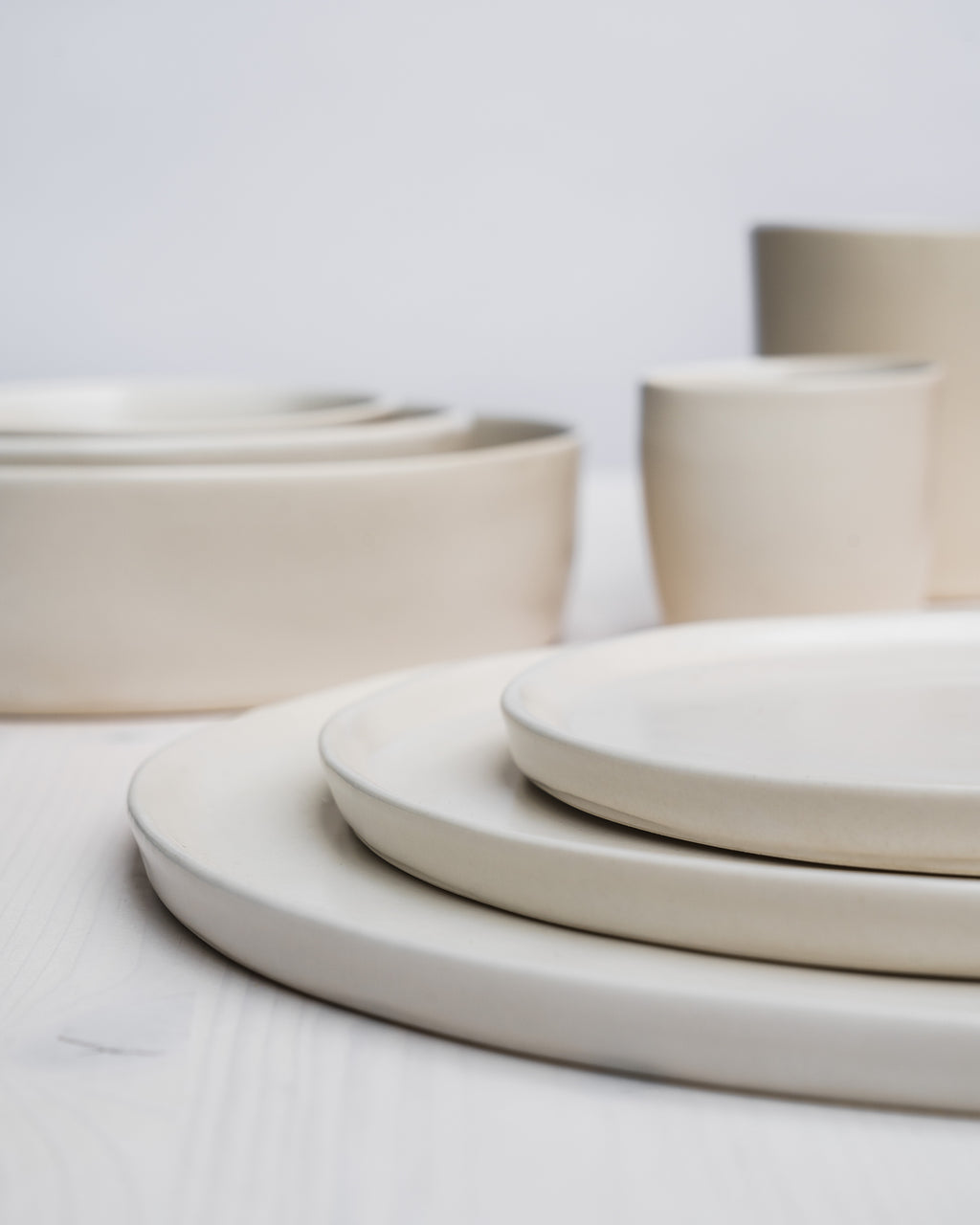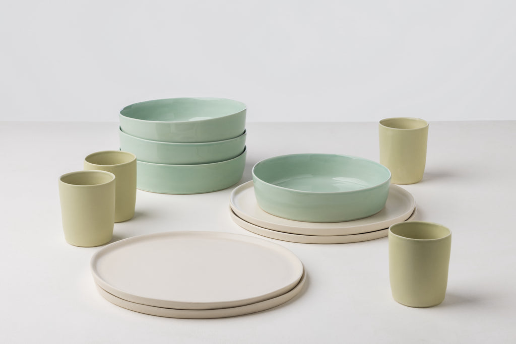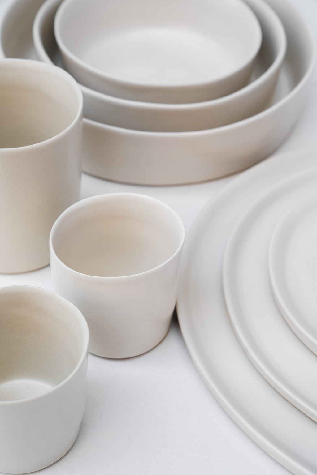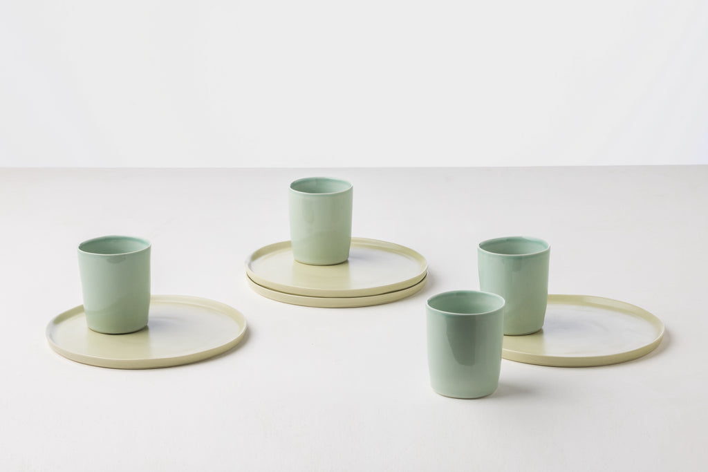 In addition to the color variants, the irregular shapes of ELEPHANT FEET reflect the workshop process when testing the glazes. In cooperation with the artist, we have further developed the shapes of the small, hand-made test molds and transferred them to a series of cups, plates and bowls. The targeted amorpho-organic randomness of this game of forms also contributes to the lively appearance of ELEPHANT FEET.
