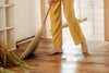 It’s a classic! This far-reaching loose sweep picks up dirt and dust better due to the split ends left on the broom, making for a soft and effective sweeper. Bound by hand on a turn of the century kick winder with a steel wire on an untreated Ash dowel. Hand-stitched organic cotton flat- weaving on a hand cranked restored stitcher.