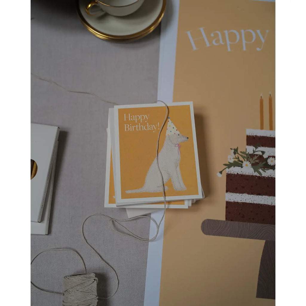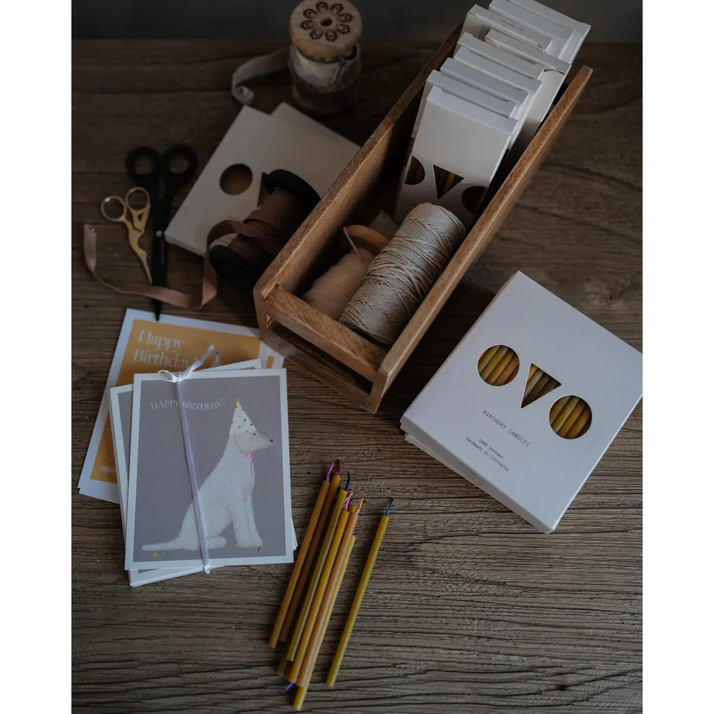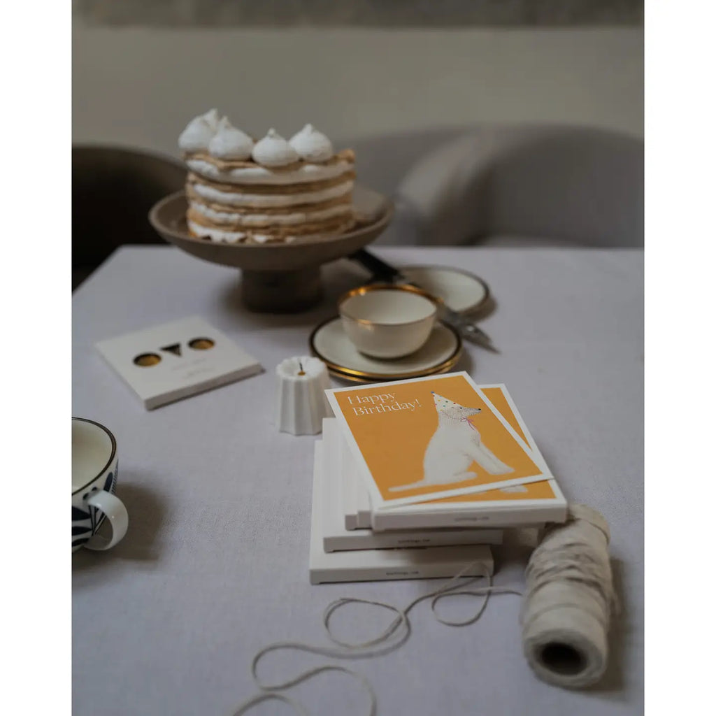 Featuring a festive poodle named Šarka and illustrated by Lithuanian artist Goda Aleliūnienė, our Happy Birthday card is sure to make anyone smile! Choose between honey or grey backgrounds, with the card printed on fine matte paper. Its size of 13,6 cm x 11,3 cm perfectly matches a box of 20 Birthday Candles. We even deliver it in a lovely ivory envelope!