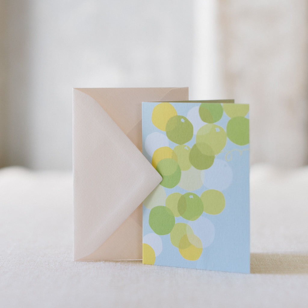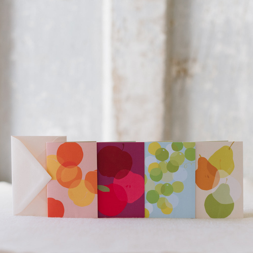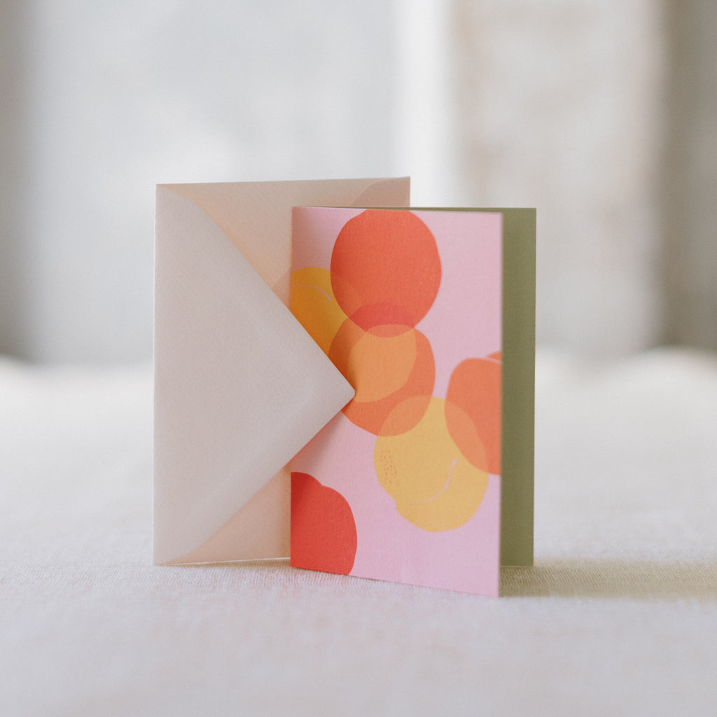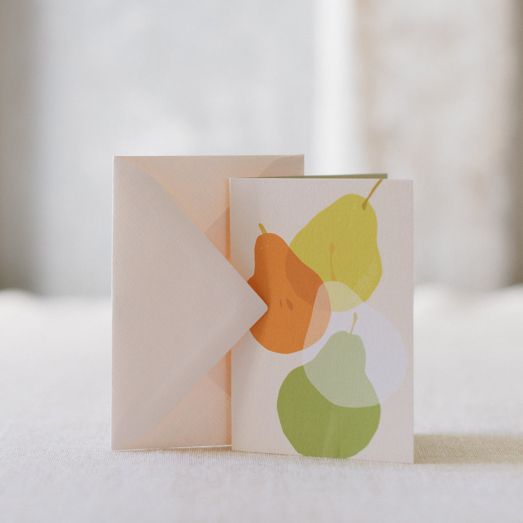 In these days of digital, to offer a hand-written card is a truly special gesture. Local Swiss fruits were illustrated by hand and set in bright colours to form a delicious collection of seasonal produce. You'll find a cool splash of colour on the inside.
