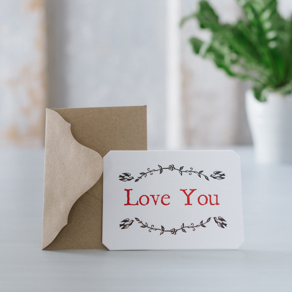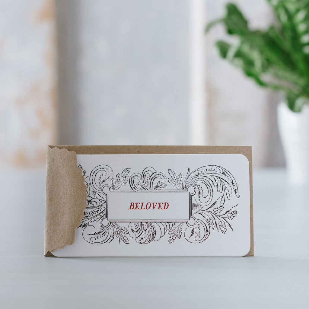 Single letterpress cards printed in black + red ink on thick diecut stock.