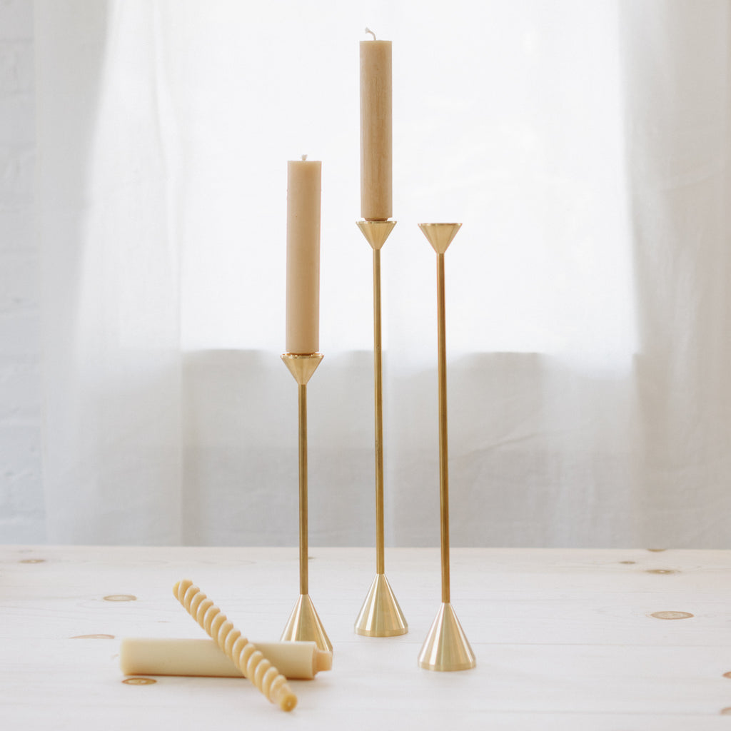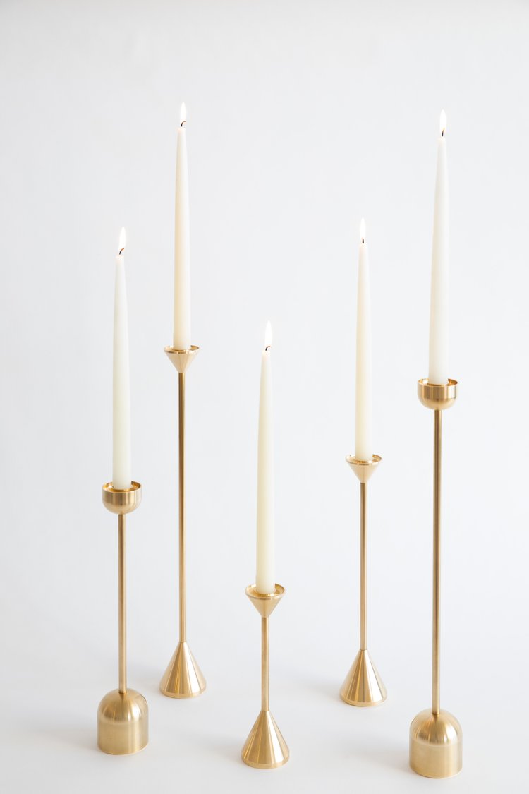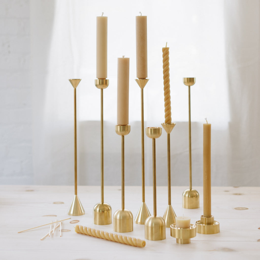 Machined from solid brass, the Spindle Candlestick demonstrates the impressive weight of brass + the precision of the tool used to form it.