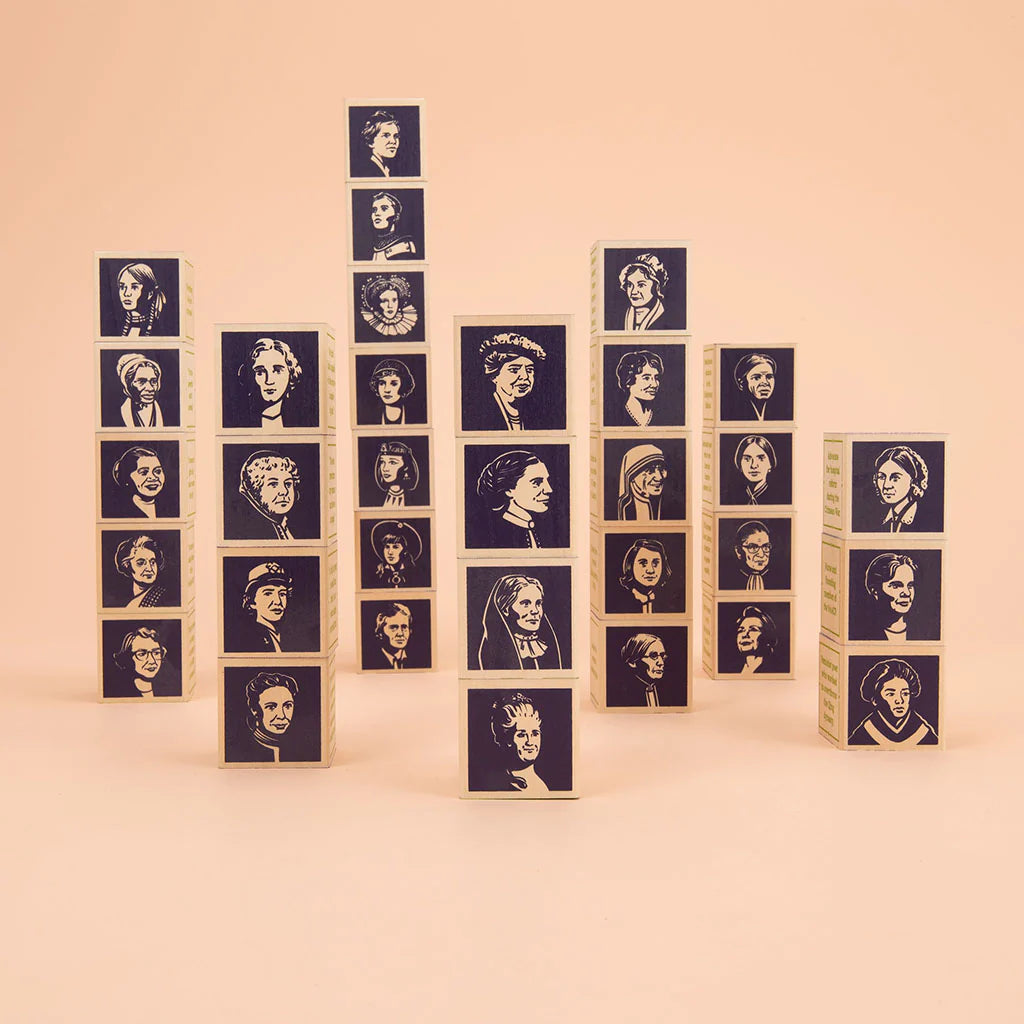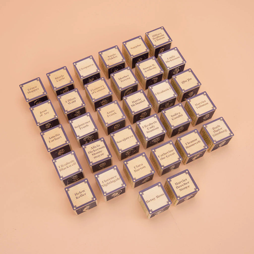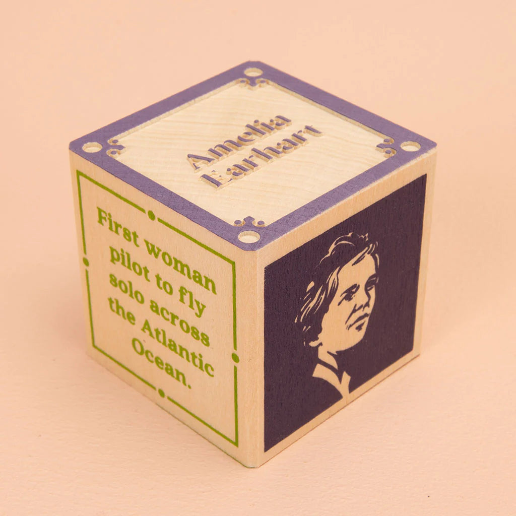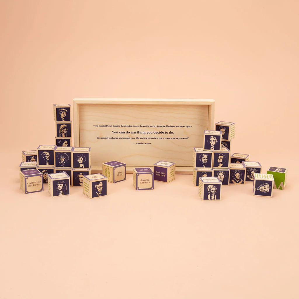This 32 block hand crafted set features the faces of women who made a significant impact in the world. One embossed side per block reveals the woman's name. Two sides feature a quote and a description of each woman's worldly contribution. The puzzle spells out "Deeds Not Words" in purple and green, the colors of the suffragette movement. Store the blocks in a handsome wood tray. We printed a quote by Amelia Earhart in the interior of the tray. Let these blocks inspire you to greatness.
